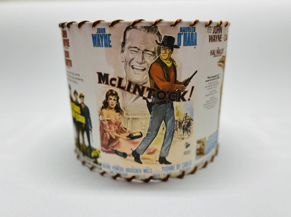 Add a touch of cowboy charm with this 11-inch Western barrel lampshade, featuring a lively movie poster print of John Wayne's McLintock and detailed latigo leather lacing.