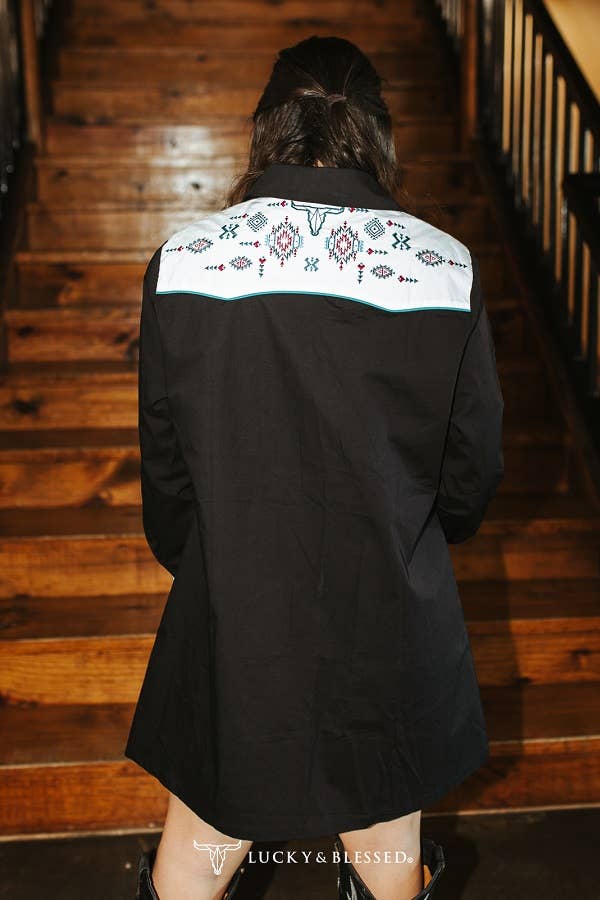This black snap-front western shirt is pure cowgirl magic — bold, beautiful, and ready to turn heads! Featuring vibrant Aztec embroidery in turquoise, pink, and cream across the chest, collar, and cuffs, it’s a perfect mix of classic western charm and boho flair. The contrast piping and pearl snaps add that authentic honky-tonk touch we all love.