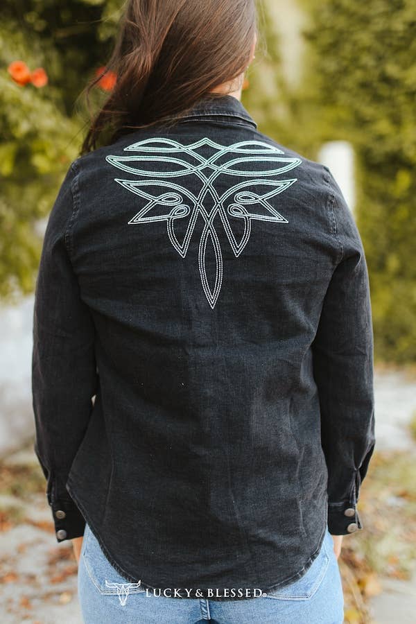 This black denim button-up shirt is the perfect mix of classic cowgirl cool and modern edge. Featuring bold white tribal-inspired stitching across the chest, it brings that subtle statement piece energy you can dress up or down. Crafted with a structured collar, front button closure, and soft denim feel — it’s made for pairing with your favorite jeans, boots, or even layered over a graphic tee for that true Urban Cowgirl vibe.