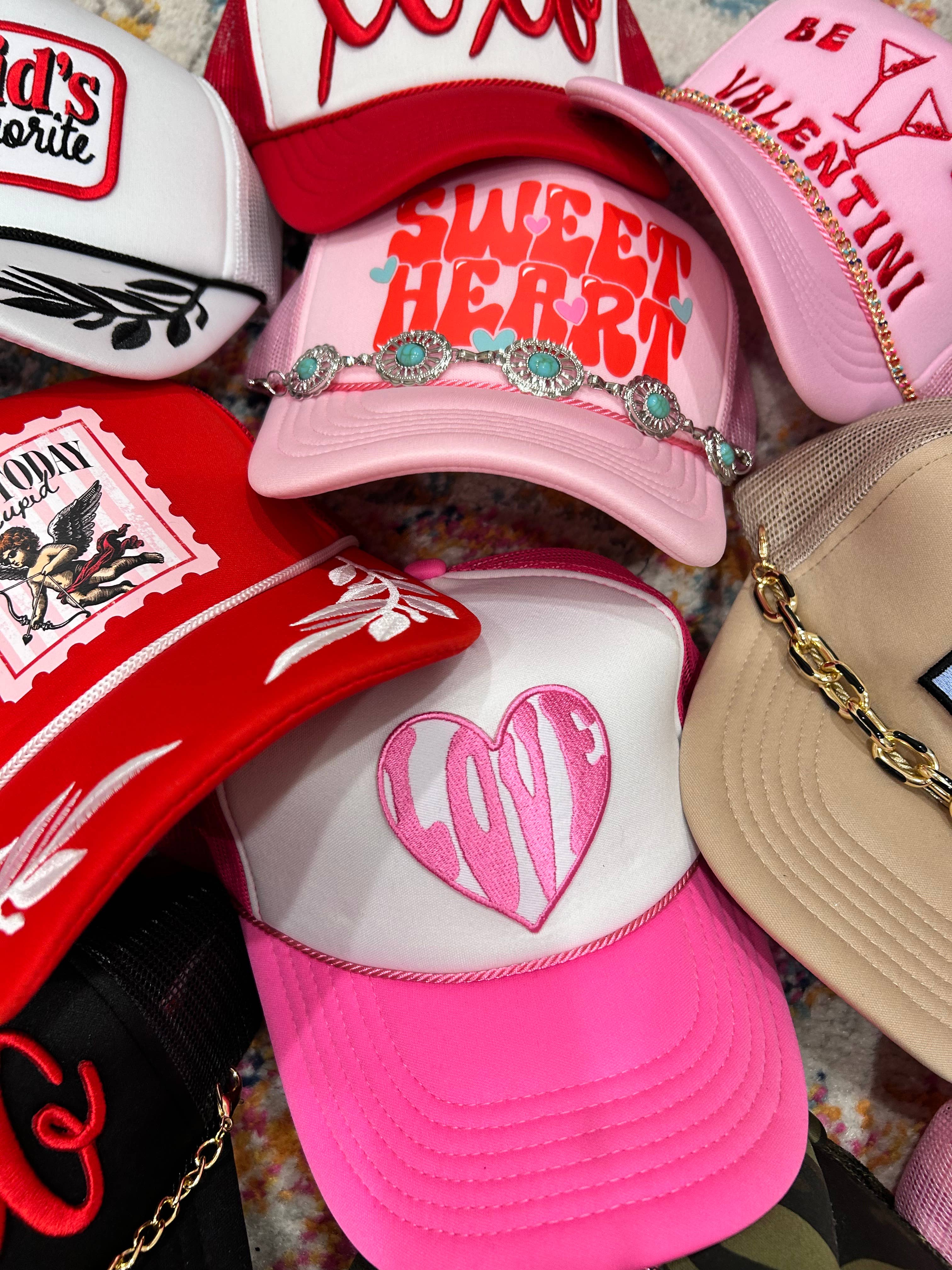 Rock a playful Valentine's vibe with this adorable Sweetheart Trucker Hat! Featuring bold red lettering accented with light blue and pink hearts, this classic trucker style combines a structured foam front with breathable mesh backing. The adjustable snapback closure ensures a perfect fit every time. Level up your look by pairing it with one of our matching trucker hat chains (sold separately) for that extra sweet touch. Whether you're celebrating love or just spreading good vibes, this hat is your new go-to accessory.