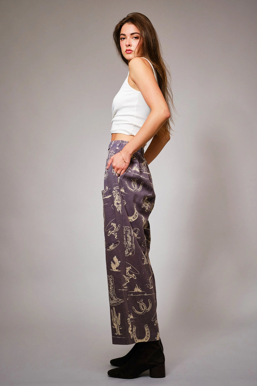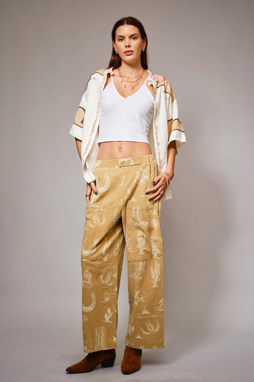 These Wide Leg Western Pants offer a lively spin on traditional western fashion. Showcasing a vintage-inspired pattern on textured, creased fabric, they add a retro flair to any outfit. The elasticized back waistband guarantees a comfy fit, and front patch pockets provide handy storage. Ideal for anyone who enjoys a laid-back silhouette with a hint of cowboy spirit!