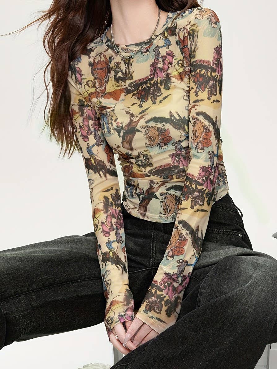 Make a bold statement with this Wild Western Cowboy Rodeo Print Sheer Mesh Fitted Top. Crafted from breathable sheer mesh, it showcases eye-catching rodeo graphics that bring authentic Western flair to your wardrobe. The fitted cut hugs your silhouette for a flattering, confident look that works beautifully layered under jackets or styled with your favorite denim. Whether you're channeling rodeo spirit or just want to add some sass to your everyday style, this piece delivers attitude with effortless edge.