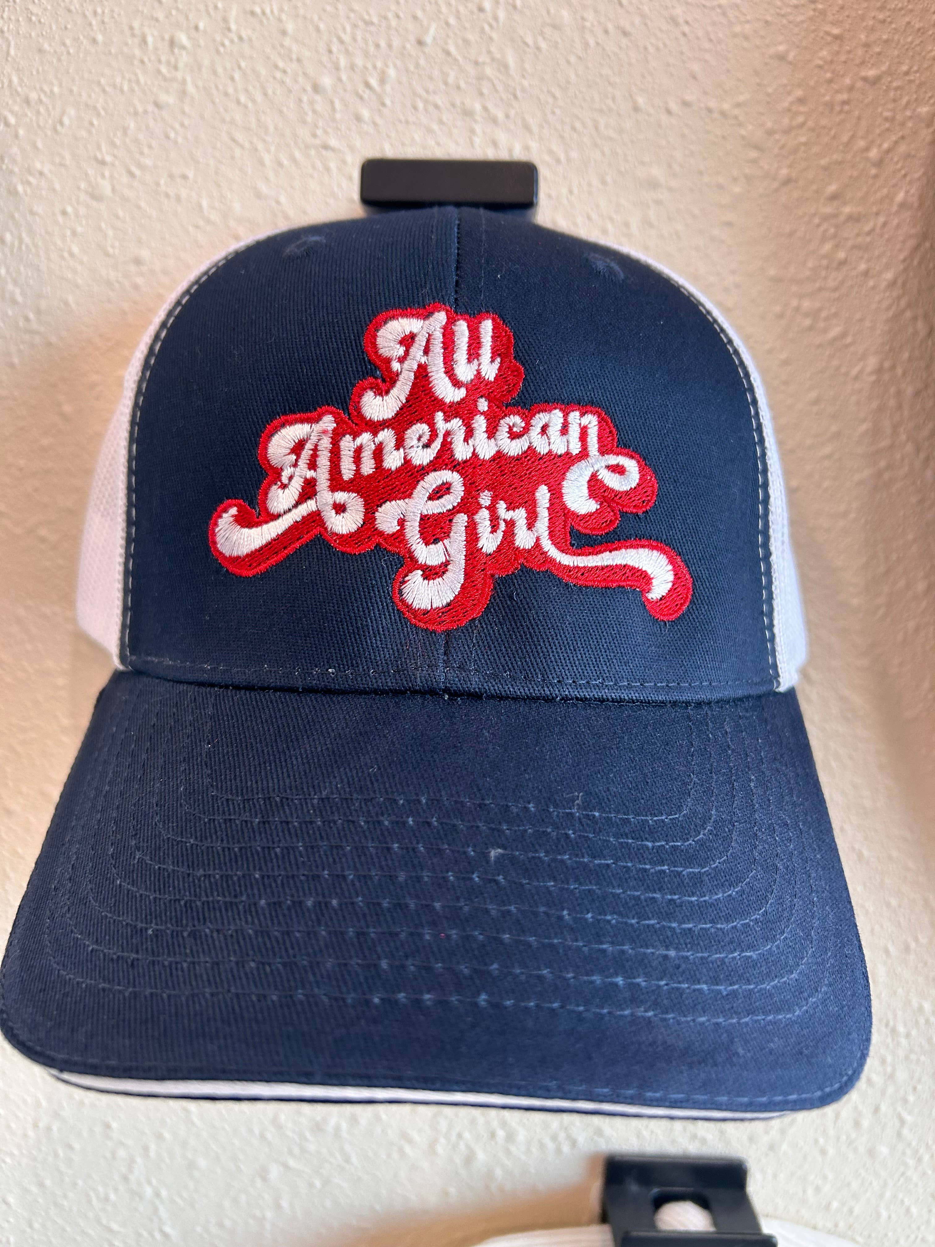 An embroidered All American Girl design on a navy blue cap. Snapback enclosure. Some stock is ready to ship on these caps. Once stock is sold through these are made to order.