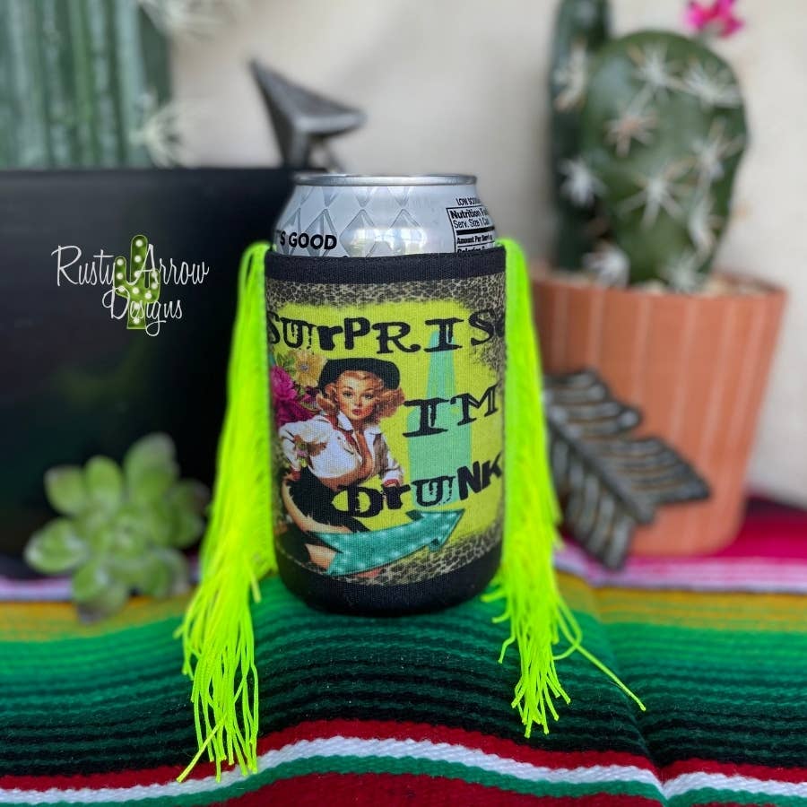 Enjoy your favorite beverage in style with the Regular Surprise I'm Drunk Fringe Koozie, featuring a 12 oz capacity, printed images on both sides, made of durable yet lightweight neoprene in a vibrant neon green, and stylish fringe detailing.