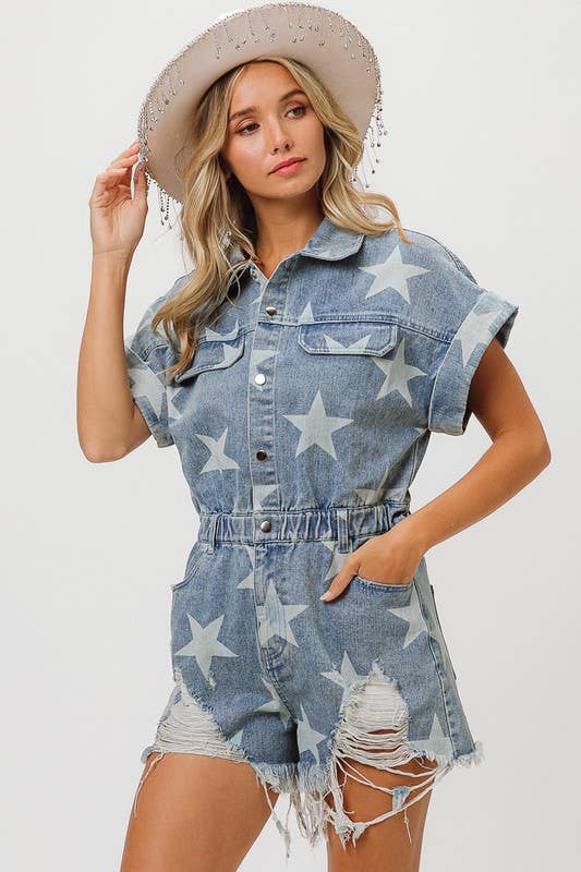 Rock a playful retro vibe with this vintage star denim romper, complete with cool distressed details for extra edge.